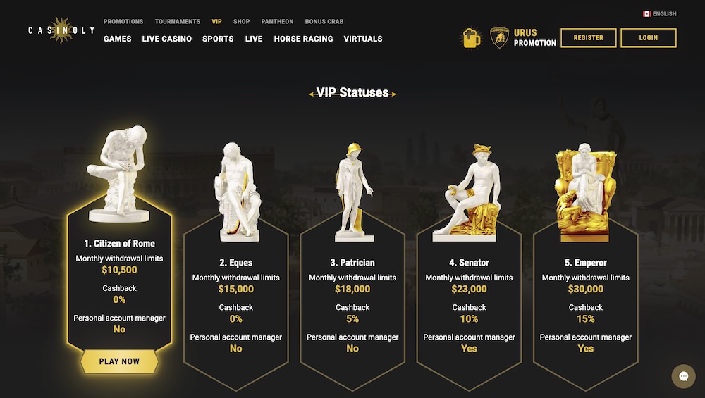 The casino hosts a VIP Club, where players climb through the Citizen of Rome to the Emperor level. There are five tiers with exclusive perks like: