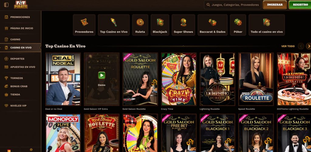 La sección de juegos de FatPirate destaca por ofrecer a los usuarios una gran variedad de títulos que incluyen máquinas tragaperras, juegos de cartas, juegos instantáneas y una sección completamente en vivo.