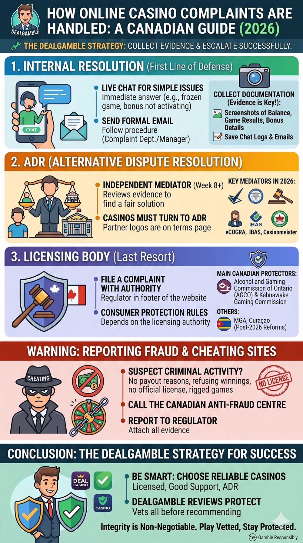 All this is not a sign of poor control, though. The iGaming industry takes complaints seriously, so licensed casinos have clear procedures for handling disputes. Online casino complaints are handled through a structured escalation process that begins with internal resolution via support and formal emails, moves to independent Alternative Dispute Resolution (ADR) mediators if unresolved, and can ultimately reach official licensing bodies for a final decision.